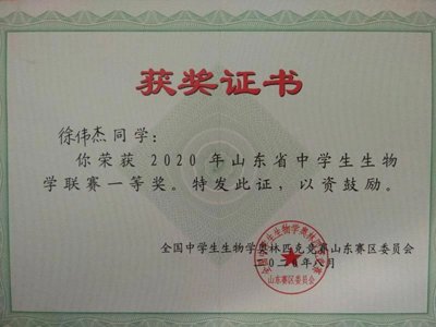 在今年的省生物学联赛中,我取得了山东省一等奖的成绩,今后我将继续努力。我很感谢老师平时对我的教导以及同学们对我的帮助。高一时刚刚接触生物,梁老师的课就让我对生物产生了浓厚的兴趣。这次生物竞赛对我来说,是一次难得的而宝贵的经历,从竞赛中获得的勇气与毅力,是取之不尽用之不竭的财富。